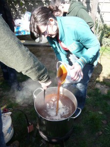 Last weekend, we decided to brew our first batch of beer with the help of our fearless leader Dave and a trusty copy of The Joy of Homebrewing by Charlie Papazian. The recipe we used (below) may look a little complicated, but it was actually pretty simple with the book in hand, a little guidance and the reminder Papazian repeats like a mantra: “Don’t worry, have a homebrew.” Lucky for us, hanging with a home brewer, there was plenty of homemade beer available to keep us inspired, from a deliciously bright Saison to a Bourbon Spiced Mystery Ale.