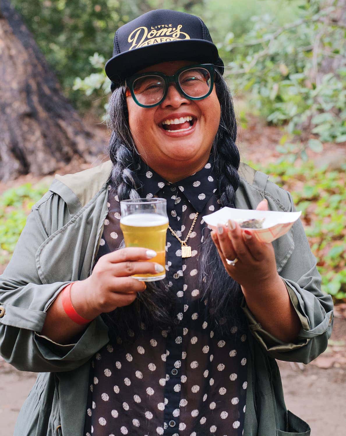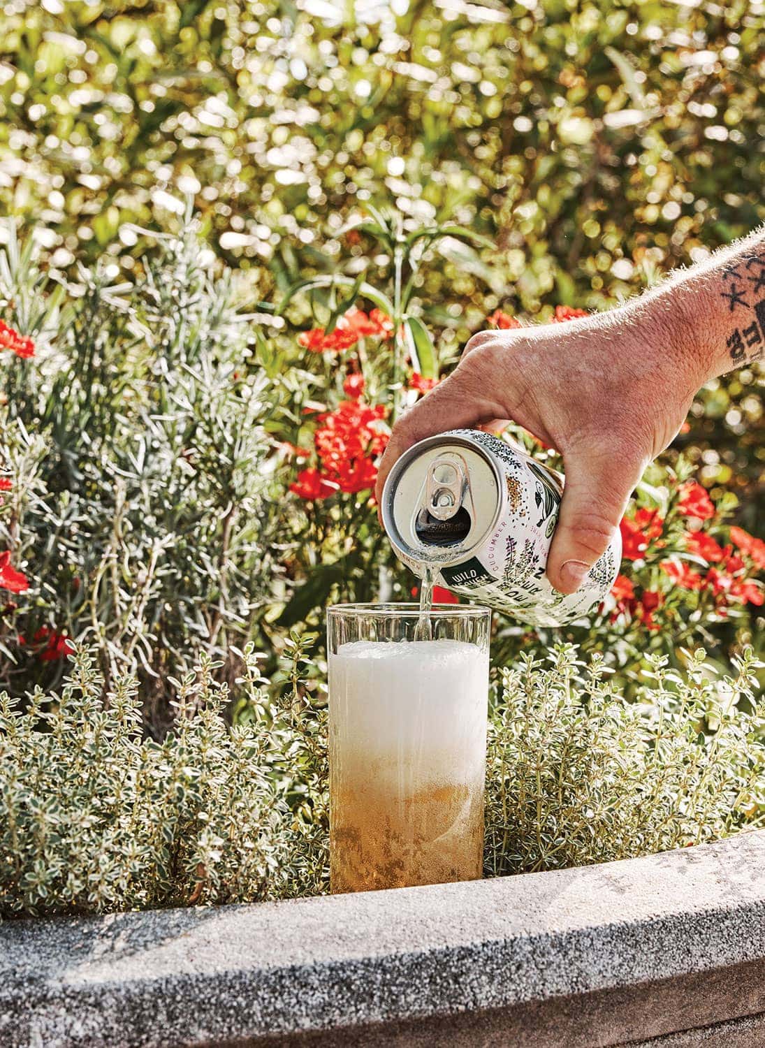 I take my tasting glass and join the 400 attendees on a winding tasting path. I first try Topa Topa Brewing’s piney Level Line pale ale finished with yerba buena, a member of the mint family. It adds an unexpected herbaceous zing, less toothpaste than lively freshness. The striking flowers of woolly bluecurls, an evergreen shrub, lend a mix of candied lavender, mint, and pine to Island Brewing’s HopLiner IPA. No herbs are added to Draughtsmen Aleworks’ Nama Biru rice lager. It’s spritzed, post-pour, with an atomizer of desert lavender–infused water. “This is a floral beer, so we add flowers to it,” says Draughtsmen Aleworks co-founder Scott Stefan.