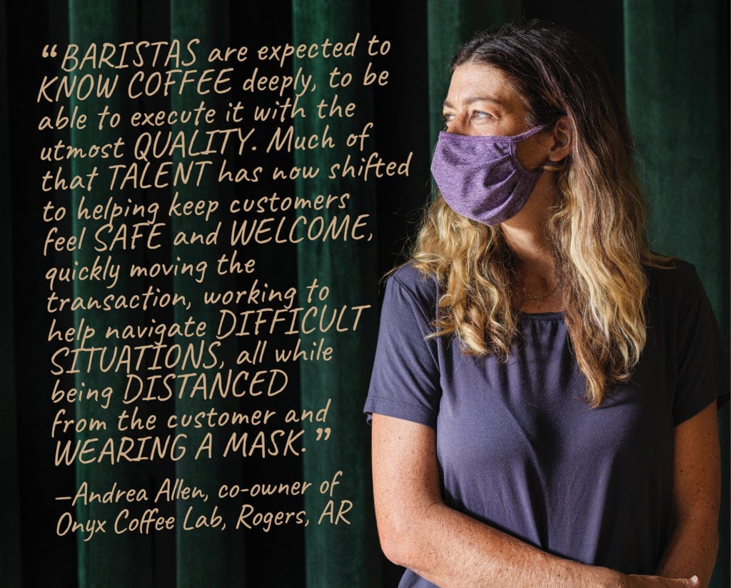 At the final step of this community’s supply chain are baristas, whose role has always en- compassed much more than making coffee, says Sam Penix, co-owner and CEO of Everyman Espresso in New York and one of the city’s best-known baristas. Penix says baristas are essential members of communities, far beyond a stable, comforting part of people’s everyday lives. That notion of stability became even more important as customers living through a pandemic sought solace in the familiar. “Being a barista has always been an important and difficult job,” says Andrea Allen, co-owner of Arkansas’ Onyx Coffee Lab and the reigning U.S. barista champion. “[Baristas] are expected to know coffee deeply, to be able to execute it with the utmost quality. Much of that talent has now shifted to helping keep customers feel safe and welcome, quickly moving the transaction, working to help navigate difficult situations, all while being distanced from the customer and wearing a mask.”