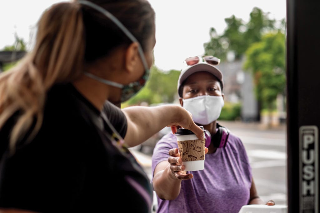 Handing off a just-made coffee went from being a pleasurable moment of interaction between barista and customer to one fraught with danger. “Our customers know this time is scary. They know it’s stressful,” says Escalante. “Especially in those first weeks—everyone was so upset and scared and they knew that waking up and going to work and serving them meant a lot. Our presence and work were comforting to them, just by being open and giving them a small sense of normalcy, and they were a comfort for us, for buying what we were selling.”