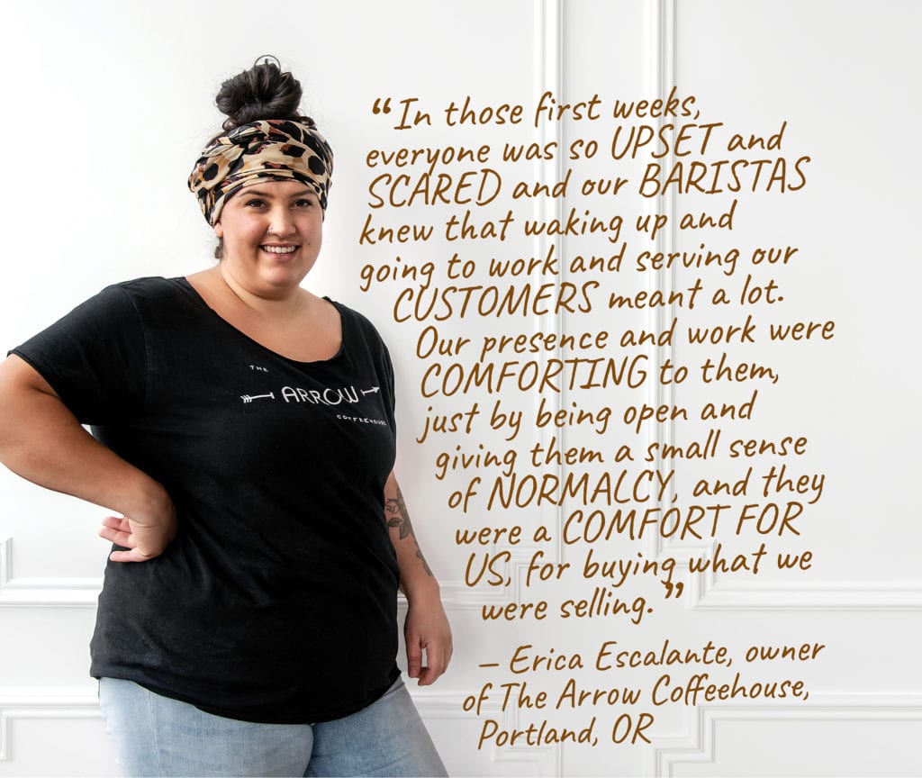 While The Arrow Coffeehouse in Portland, Oregon, quickly lost a sizeable chunk of its gross sales, says owner Erica Escalante, “the COVID-19 pandemic has given us the freedom to innovate and make our own rules. Especially in the beginning, when a lot of places were not open, it was like the door of creativity was wide open to make and sell whatever we could think of. Any specialty sauce we have? Put it in a jar and sell it. Bottle the iced coffee and sell it. Feel like eating burgers today? Make and sell them. It was my housemate’s birthday and he requested cheesecake—I ended up just making six, and listing them for sale.”