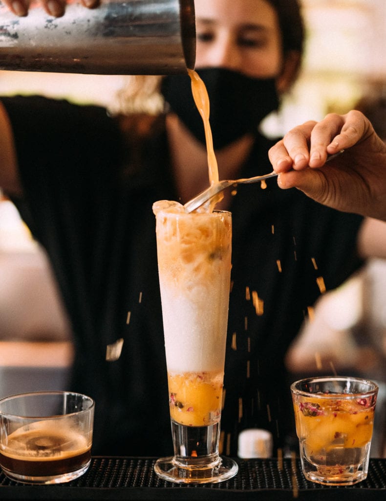 Within its storied walls, today’s Gilly “bartists” happily serve the usual drips and lattes, but the anchor of their program is what Brown calls “elixirs:” creative tea and coffee-based concoctions that are infused with deeper stories and meaning. For example, the Spring 2021 “Masters Collection” of elixirs—inspired by the music of experimental Black artists—features recipes influenced by the works of Erykah Badu, D’Angelo, Questlove, Roy Hargrove, and Talib Kweli. Drinks like the Peaches & Cream–inspired beverage, served with a petal punch called “Roses” (named after the OutKast song) was a dessert-like elixir made with Georgia peaches, rose buds, crushed ice, goat’s milk, rose water simple syrup, and a single-origin coffee from Quindio, the western central region of Colombia.