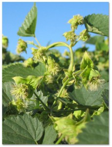 I planted three Cascade hop plants at the base of the arbor last August, knowing I wouldn’t get much growth, but I’d be laying groundwork for this year. Hops don’t usually produce many flowers their first season, so if you want to harvest hops next year, you can plant them this year to establish roots. After the summer, I cut the plants down to the ground, mulched them and waited for summer. Once the plants sprouted, I set up twine to the top of the arbor for vine support and wound new growth around the string. Once it warms up, hops send up vine shoots very fast; I swear I actually witnessed growth during the course of dinner at our picnic table below one evening.