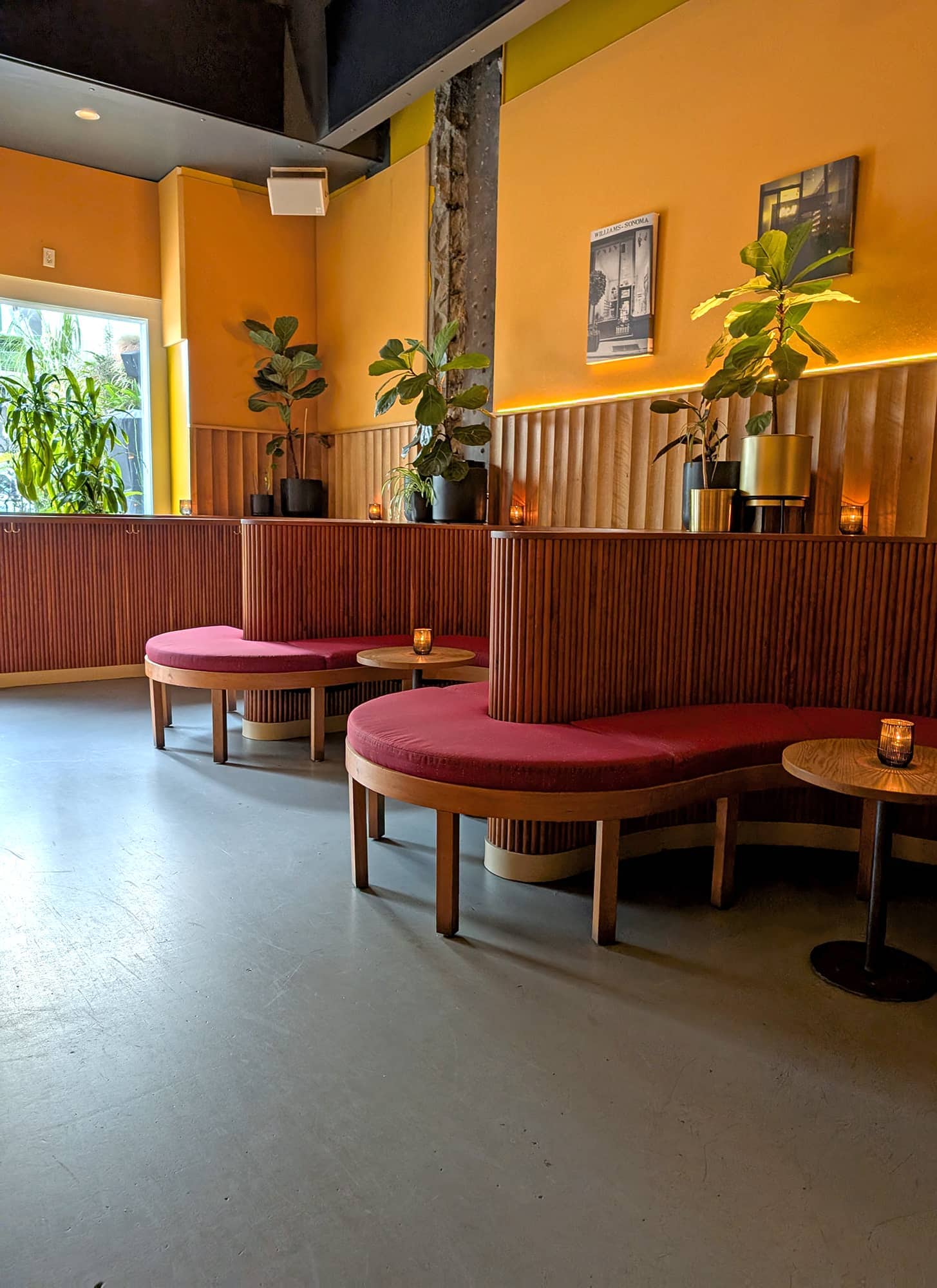 We reopened in the new space at 550 Sutter in March 2022. Our contractor was amazing—and we had the opportunity to design our space. The new space is absolutely gorgeous. I wanted to lean into the Pacific islands and Asian flavors by going a little brighter. We decided to go with brighter cherry wood and a lot of texture. The technical name for the color of the walls is mango. So it brings a little bit of warmth, a little bit of the tropics. Instead of banquettes facing the bar with all the guests staring at everyone at the bar, we intentionally curved every seat and every little nook. So, when you sit down, you still feel like you’re part of the bar.