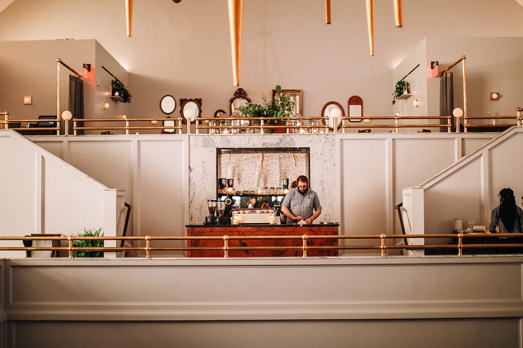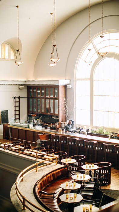A cathedral-like milk glass window sets a dramatic tone for the bar at A Rake’s Progress, one of the new restaurants in the LINE hotel in Washington, D.C. “I’ve always enjoyed old buildings, being from Baltimore, but this space has a grandness and elegance to it that inspired the direction for the bar from the beginning,” says beverage director and partner Corey Polyoka. “The large window was always at home in a church, and it was beckoning to be reimagined as a back bar. Getting service started under the ‘Golden Hour’ light in that grand space makes our approach to drinks feel important and significant in a new way.”