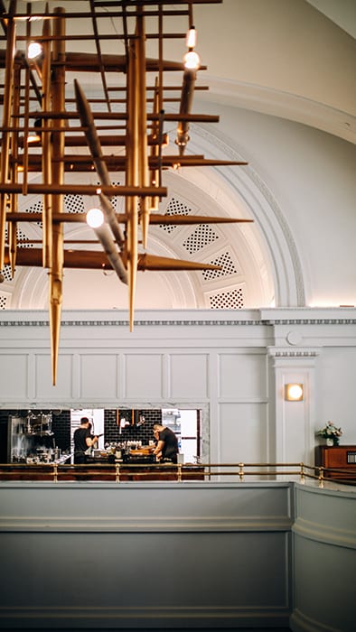 Housed in a 110-year-old former church in the Adams Morgan neighborhood, the LINE has three restaurants, two bars and a coffee shop in addition to guest rooms. At A Rake’s Progress, the dining room occupies the area that was formerly used as balcony seating in the main sanctuary of the church, says Sana Keefer, The LINE’s global brand director. “We attempted to incorporate as many existing design elements into the space as we could,” she adds. “Specifically, we restored existing plaster moldings, the existing milk glass windows, the stone stairs and wood handrails leading up to the restaurant and all of the pendant lighting fixtures were original to the church and restored. We also repurposed the original pipes from the church organ to create the main chandelier in the space.”