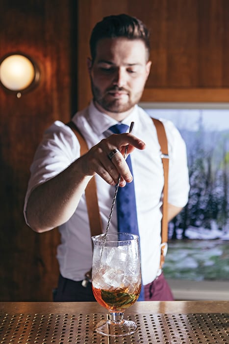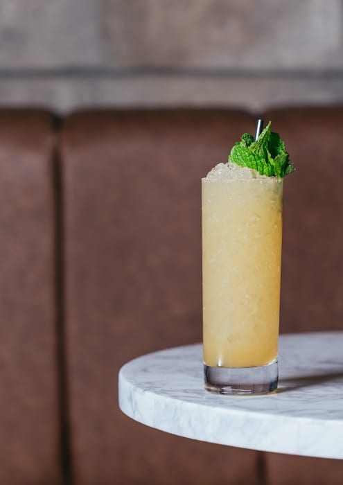 For the drinks at Platform 18, the menu features a storyline built around a fictional character named Hollis Cottley Pennington, a railroad tycoon and bootlegger inspired by the real-life story of George Remus. Many recipes are built off classic cocktail templates with high-level modern technique used behind the scenes to adjust flavors for modern tastes. “We use some drinks from around the time of Prohibition—historic, vintage, classic cocktails—but the genesis of our menu is built around how flavors work together. Whether it’s clarifying or using centrifuges, or using micro-distillation for non-alcoholic ingredients, we’re using a little science when appropriate,” Asher says.