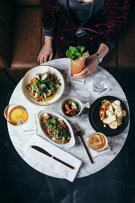 The experience begins in Century Grand, the restaurant and bar modeled after an art deco 1920s-era train station. Bold, geometric concrete walls, patterned ceiling tiles and glitzy glass chandeliers set an opulent the tone from the get-go. “When guests enter the building they touch the wall. They look at each other, then look at us and you can see the question on their lips of, ‘Was this here before?’ It’s a crazy amount of concrete,” says Furnari. “The way the room undulates and the lights go up and down the walls catch and create shadows, it’s the whole mood of the space. It’s great architecture.” Here, dishes are pushed around the room on dim sum–style carts, the wine is natural, and the cocktail menu is divided by railroad lines. “There are 26 cocktails in the dining room developed around the expansion of the rail lines, so on the menu we share the ups and downs of that history, too,” says Asher.