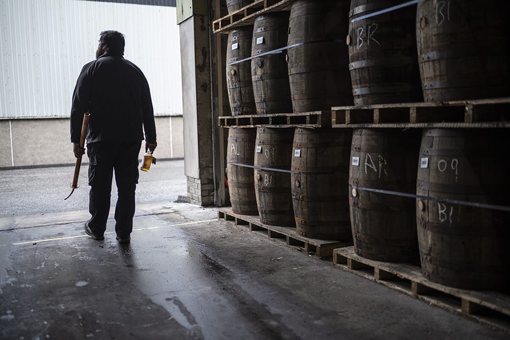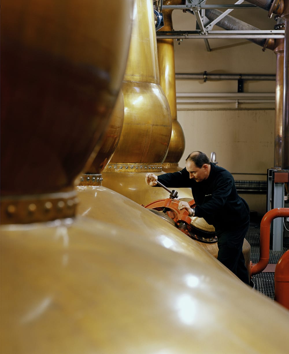 Next are the stills. Coppersmith Dennis McBain has been with the distillery for 64 years, so he knows each still inside and out. “He can tap different parts of the stills to know how thin or thick they are. Parts of them get thinner because they are working harder than others, so he’ll cut those out and replace them,” Strachan says. “Every time he replaces part of a still, before we start making whisky, he grabs a big bush of juniper, throws it in there, and boils off some liquid. We don’t have any scientific or technical reason for that, but it was the way Dennis was taught, and in his words, it sweetens the still. It’s how they’ve always done it, how they will always do it so that the whisky will not change.”