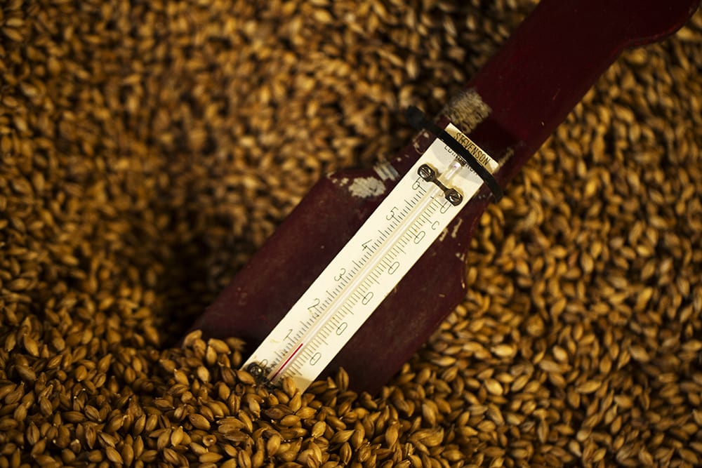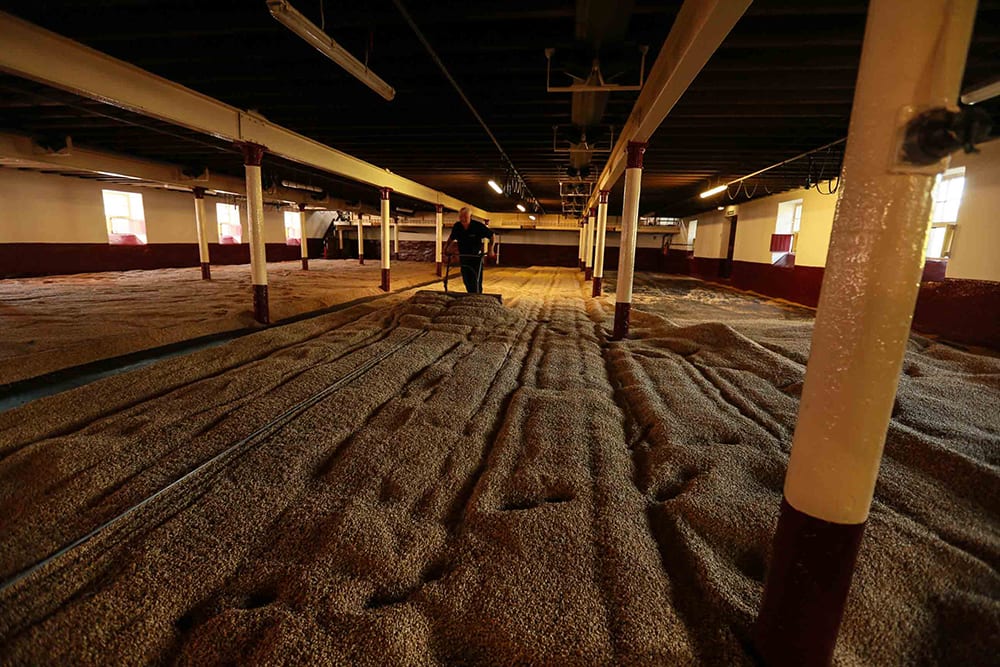As with all whisky, production starts with the barley, of which a portion is grown on Balvenie Mains, a one-thousand-acre farm adjacent to the distillery. The grains are steeped in spring water for 48 hours, then spread out on the floor to germinate. Only a few distilleries have their own malting floor in Scotland. At The Balvenie, it’s a similar size to a tennis court, says Strachan, not quite big enough for how much whisky they make (instead they use a marriage of three grains: some industrial malted, some unmalted then malted on site, and the home grown and home malted) but just the right size to allow the maltsters to turn it by hand until it’s ready for to dry in the kiln. “That building has been there since 1929 and when you get up into the roof space it’s really beautiful. It’s a nice historical piece of whisky making that more wish they could do on site.”