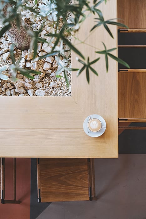 Roastery Del Sur was designed to integrate Verve’s manufacturing with retail, introduce the coffee roaster as a culinary player, and operate as an inspiring R&D center. “Some people hide the production aspects of their business, but we’ve always liked to let people see the process ‘behind the curtain.’ ” says Barr. Despite the immense scope of the project, every detail was carefully considered. The service counter is designed as a mid-century credenza piece drawn forward from the barista bar to stand as a floating island within the café, encouraging interaction between staff and customers. “We like removing barriers, whether it be using as much glass as possible, or creating more flow from inside to outside, from service to customer,” says Barr.
