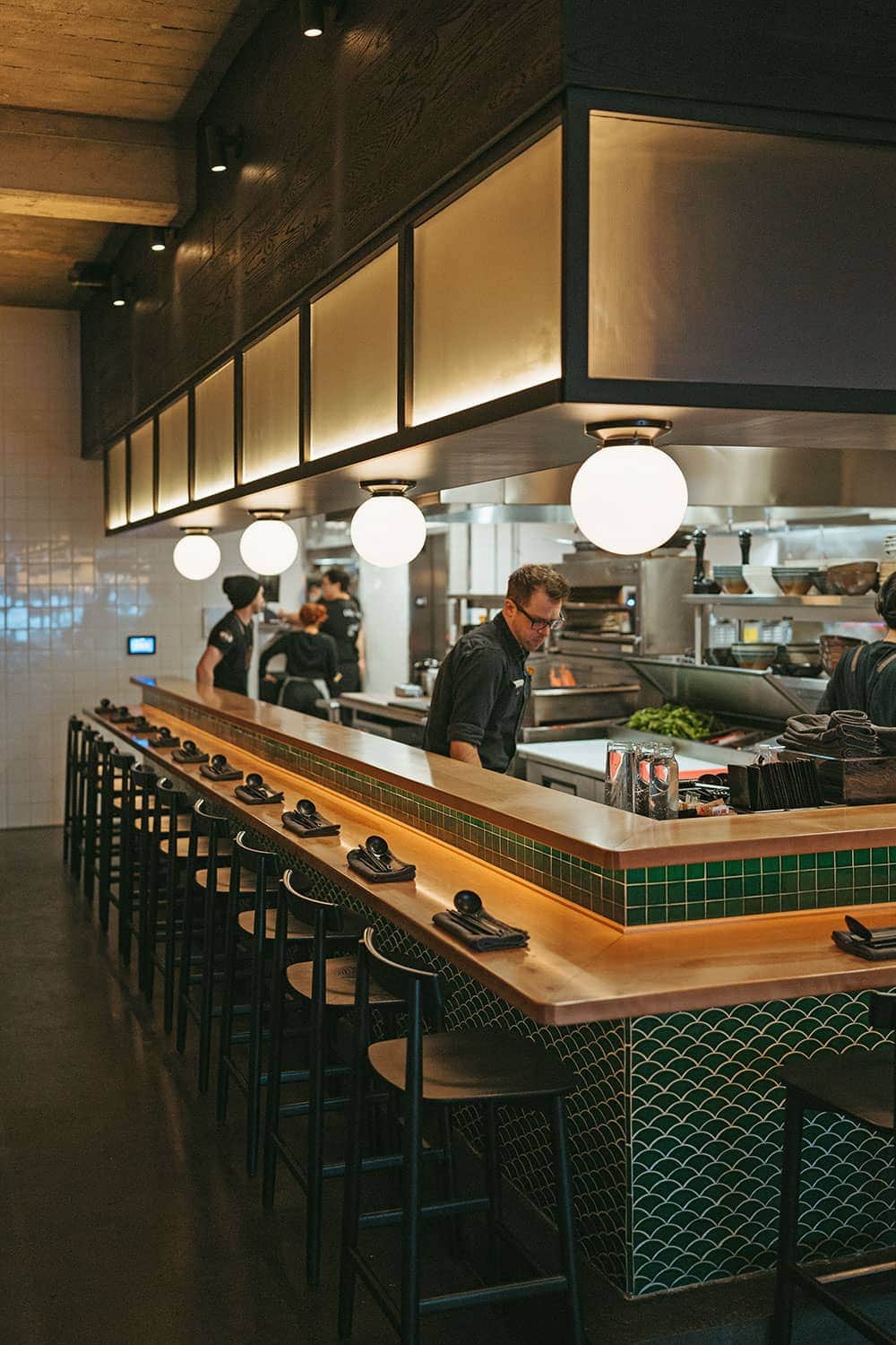 The open-concept kitchen with bar dining pays homage to traditional ramen spots in Japan. | Photo by Connor David Photography