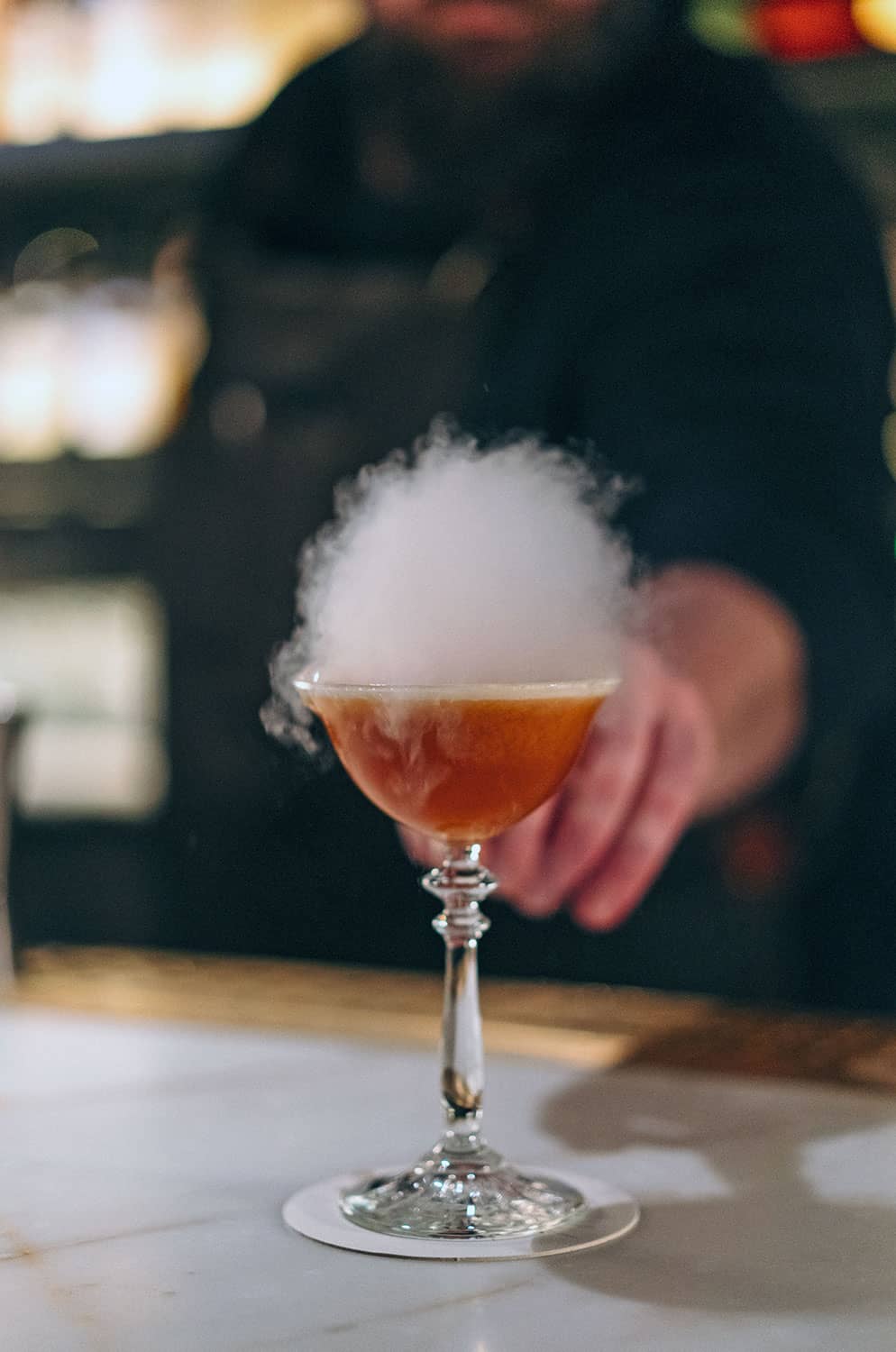 BB Queen: Toki whisky, passion fruit, pomegranate, L’apertivo Nonino, all topped with a citrus smoke bubble. | Photo by Connor David Photography