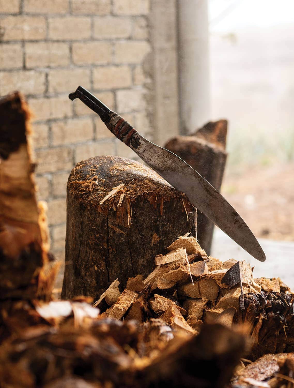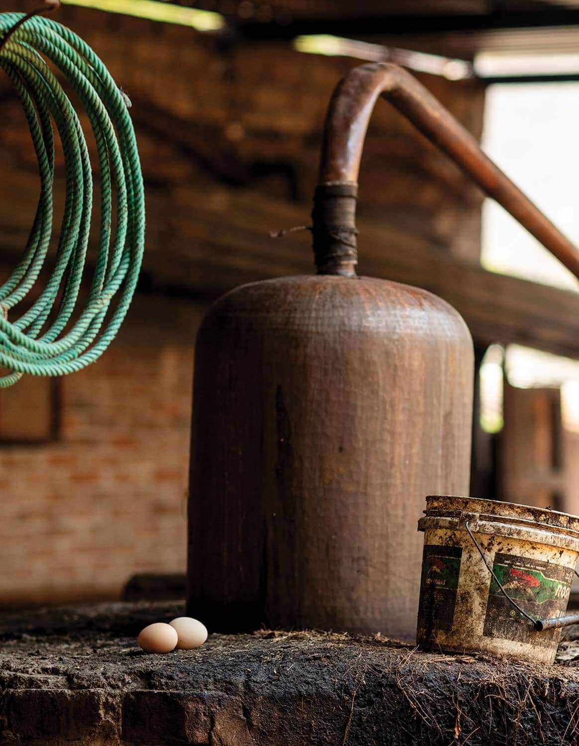 The new palenque promises a smooth handoff and a future for Lalo and his children, but “new” here is still relative. Three worn, wooden fermentation vats sit in the shade under a curved, corrugated metal roof. There’s no electricity or instrumentation, just a few open bulbs for late-night checking of the stills. The hail continues, but under the safety of the roof, Tío Tello’s neighbors continue processing the agaves by hand in a practiced dance—one shaving off chips of roasted agave with a machete, while the other smashes the pieces to bits with an old wooden mallet.