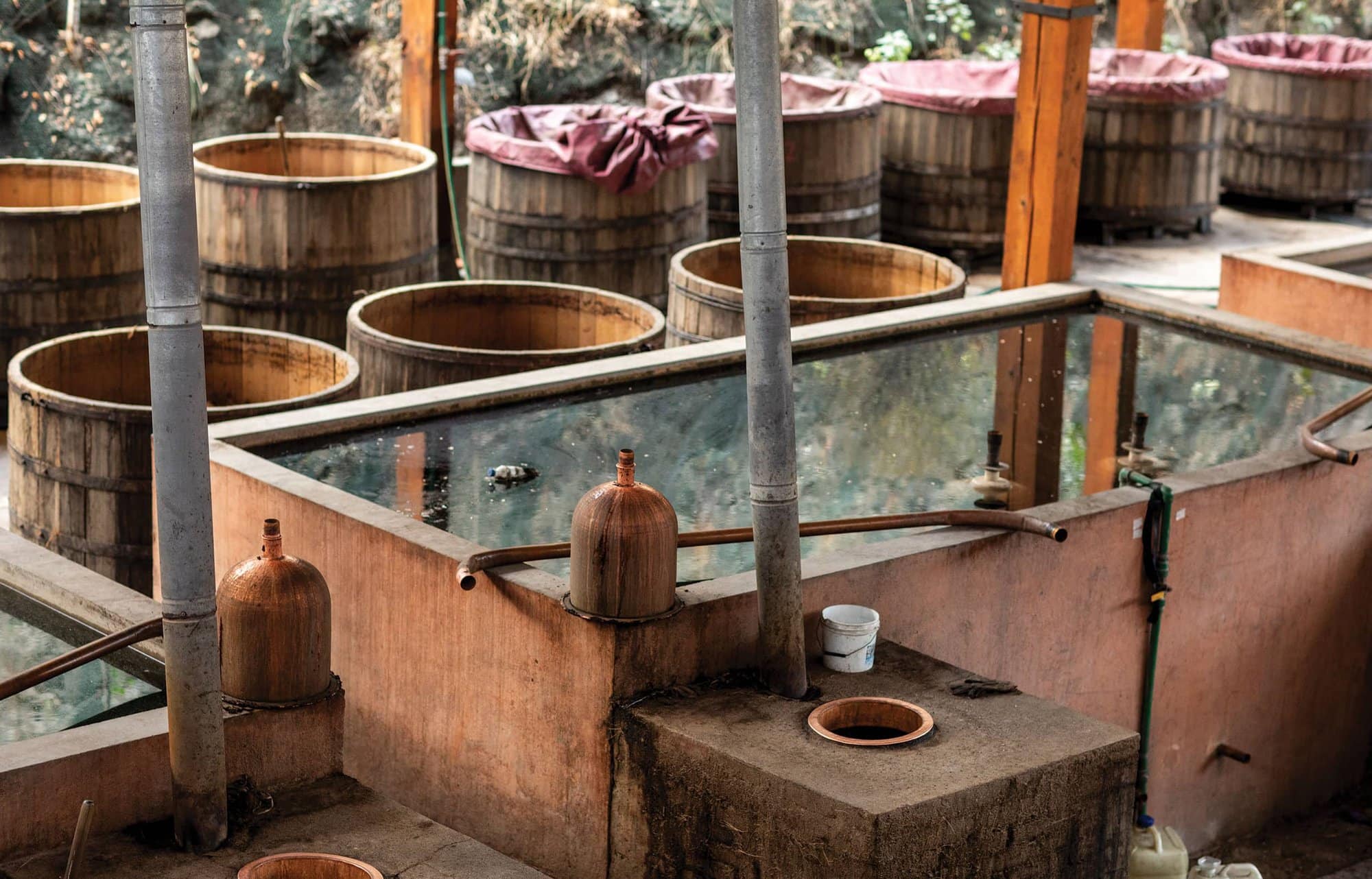The most significant change was the movement to double distillation, mimicking industrialized tequila techniques. Distilling techniques were refined in the ’90s as the Consejo Regulador de Mezcal (CRM) was created to standardize and certify mezcal production. Traditional clay cantaritos used for storage were exchanged for plastic drums and glass garrafones (demijohns). Many producers switched to copper and stainless-steel stills from clay or refrescadera-style stills with a plate in the chamber, and many even shifted from making lower-proofed, true single distillates.